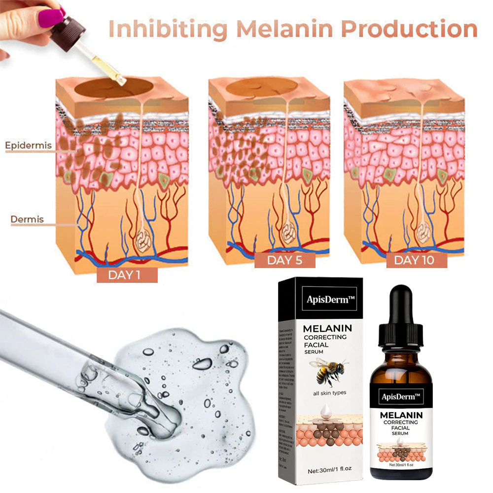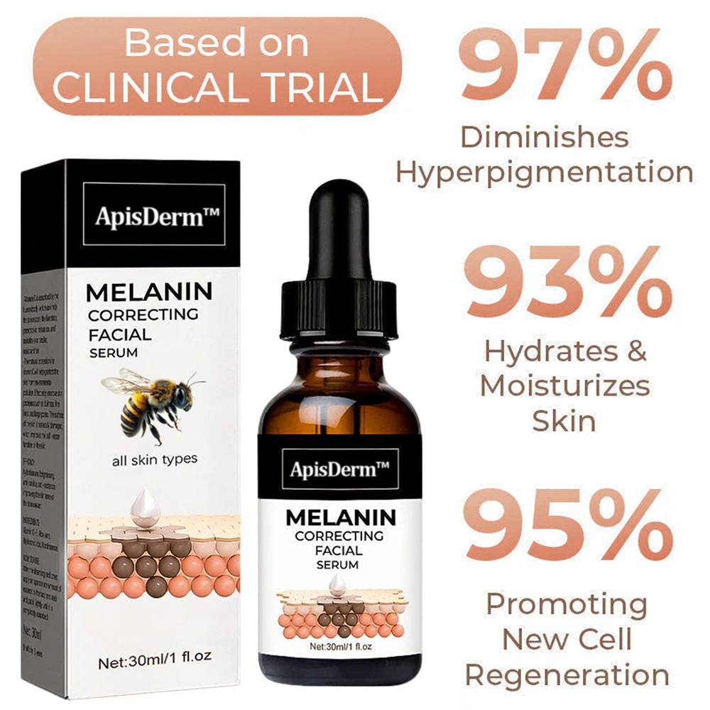 ApisDerm™ Melanin Correcting Facial Serum Contains special bee venom peptides, which are bioactive peptides extracted from bee venom with various beneficial skin care and health functions. Bee venom peptides effectively reduce melanin production in the skin, break down existing dark clusters, and promote the growth of new healthy skin cells, helping to fade hyperpigmentation.