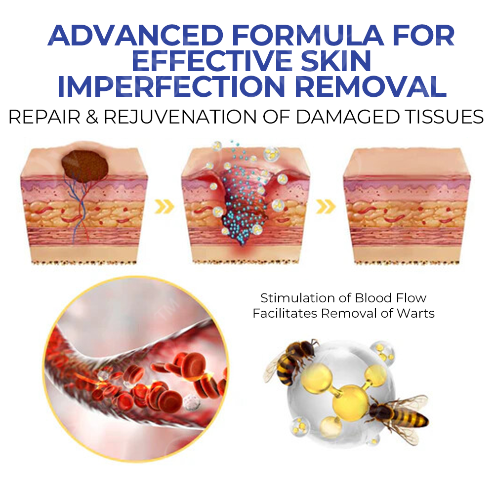 Bee venom is packed with bioactive compounds that break down abnormal skin tissue, promoting the removal of skin tags, moles, warts, and other imperfections. Known for its healing properties, bee venom not only accelerates the healing process but also stimulates blood circulation, helping your skin regenerate and recover faster.