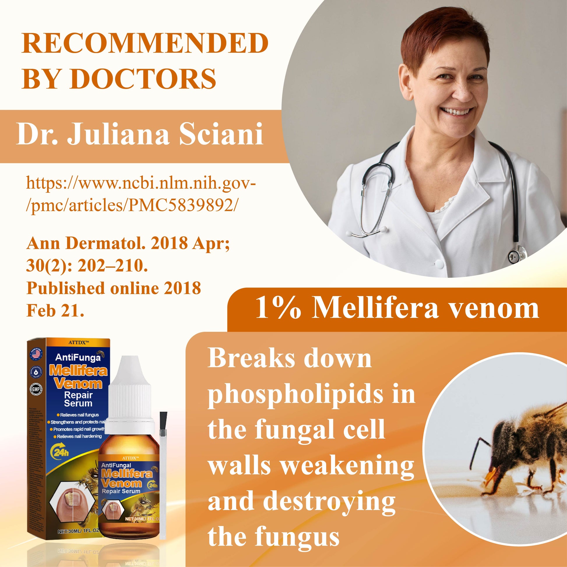 Dr. Sciani states, “The potent components of this product effectively target fungal infections while also reducing inflammation, leading to faster recovery.” She adds, “The unique formulation not only eliminates the fungus but also supports the body’s natural healing processes.” The product's effectiveness is further enhanced by Phospholipase A2, which breaks down phospholipids in the fungal cell walls, weakening and destroying the fungus, while apamin and hyaluronidase act as anti-inflammatory agents, reducing inflammation and promoting faster recovery. The combination of these bioactive compounds in Mellifera venom works synergistically to promote healing and prevent future infections, making this innovative product a significant advancement in the treatment of stubborn fungal issues.