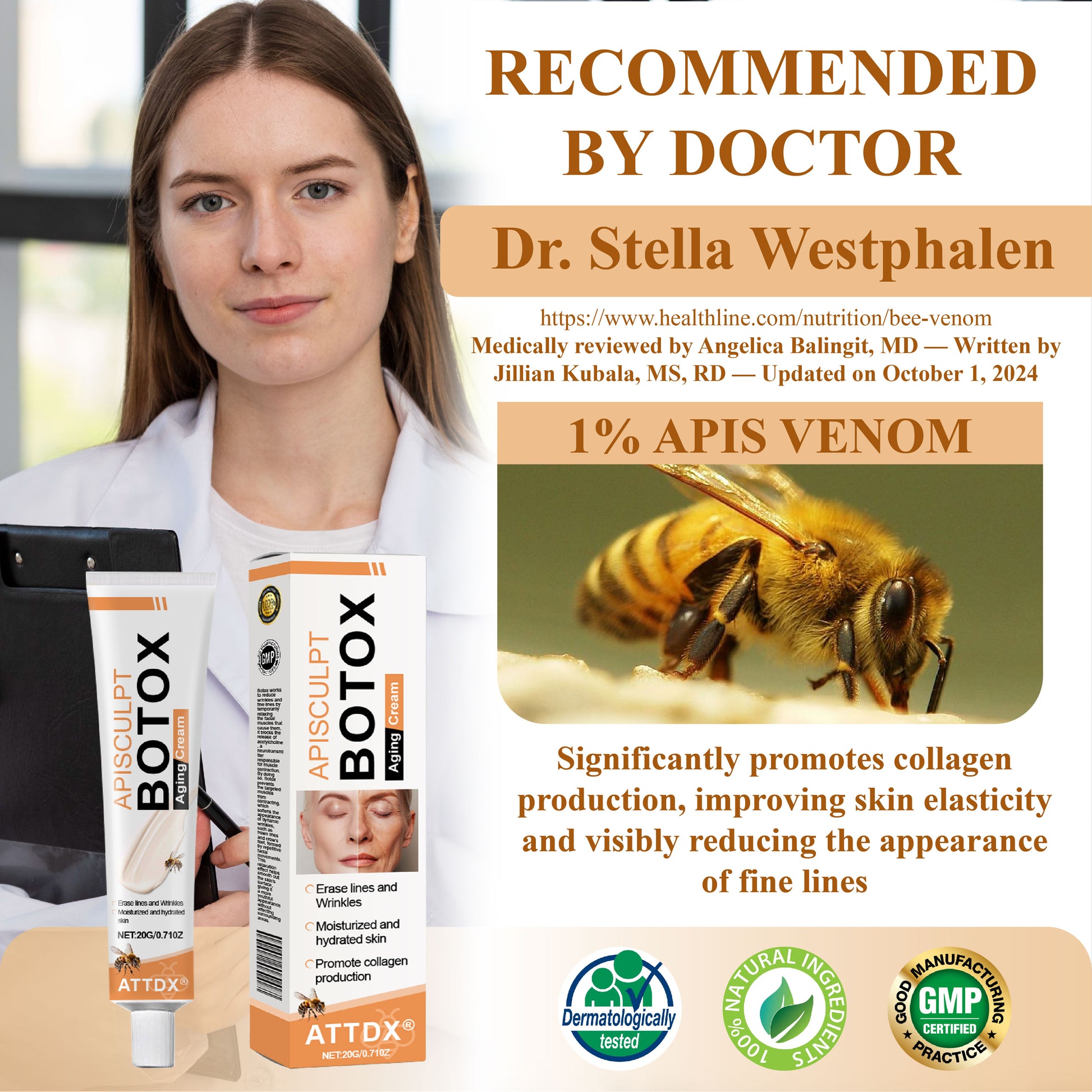 ATTDX® ApiSculpt BotoxAging Cream leverages the benefits of Apis venom, with melittin to reduce inflammation, stimulate collagen production, and enhance blood circulation for improved skin regeneration and reduced wrinkles.