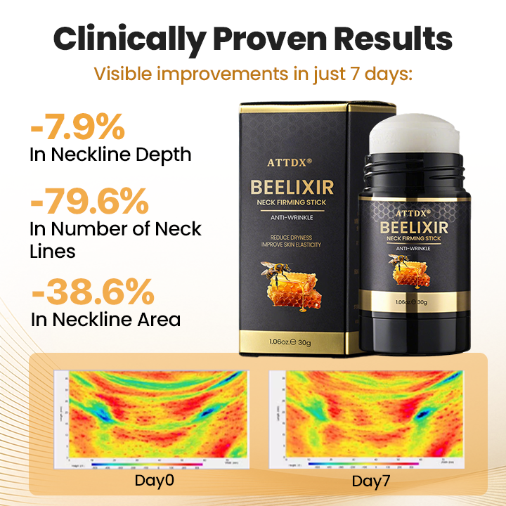 Women aged 30-70 reported unparalleled improvements after using ATTDX® BeeLixir Neck Firming Stick for just weeks, including visible skin firmness, reduced wrinkles, and a rejuvenated appearance.