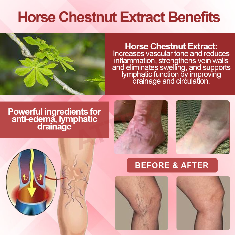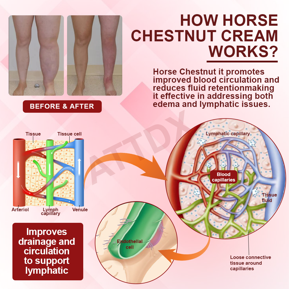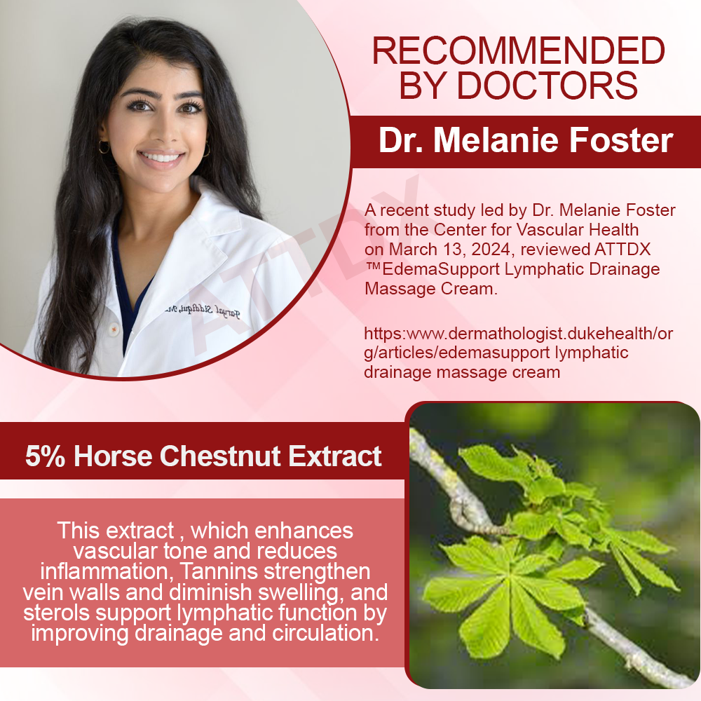Studies indicate that the active compound in horse chestnut, Aescin, possesses anti-inflammatory properties. It helps reduce swelling by improving blood circulation and strengthening blood vessel walls, which can prevent fluid leakage into surrounding tissues. Therefore, our ATTDX™ EdemaSupport Lymphatic Drainage Massage Cream formula with 5% horse chestnut, combined with three other key ingredients, effectively addresses issues such as edema, lymphatic health, and varicose veins.