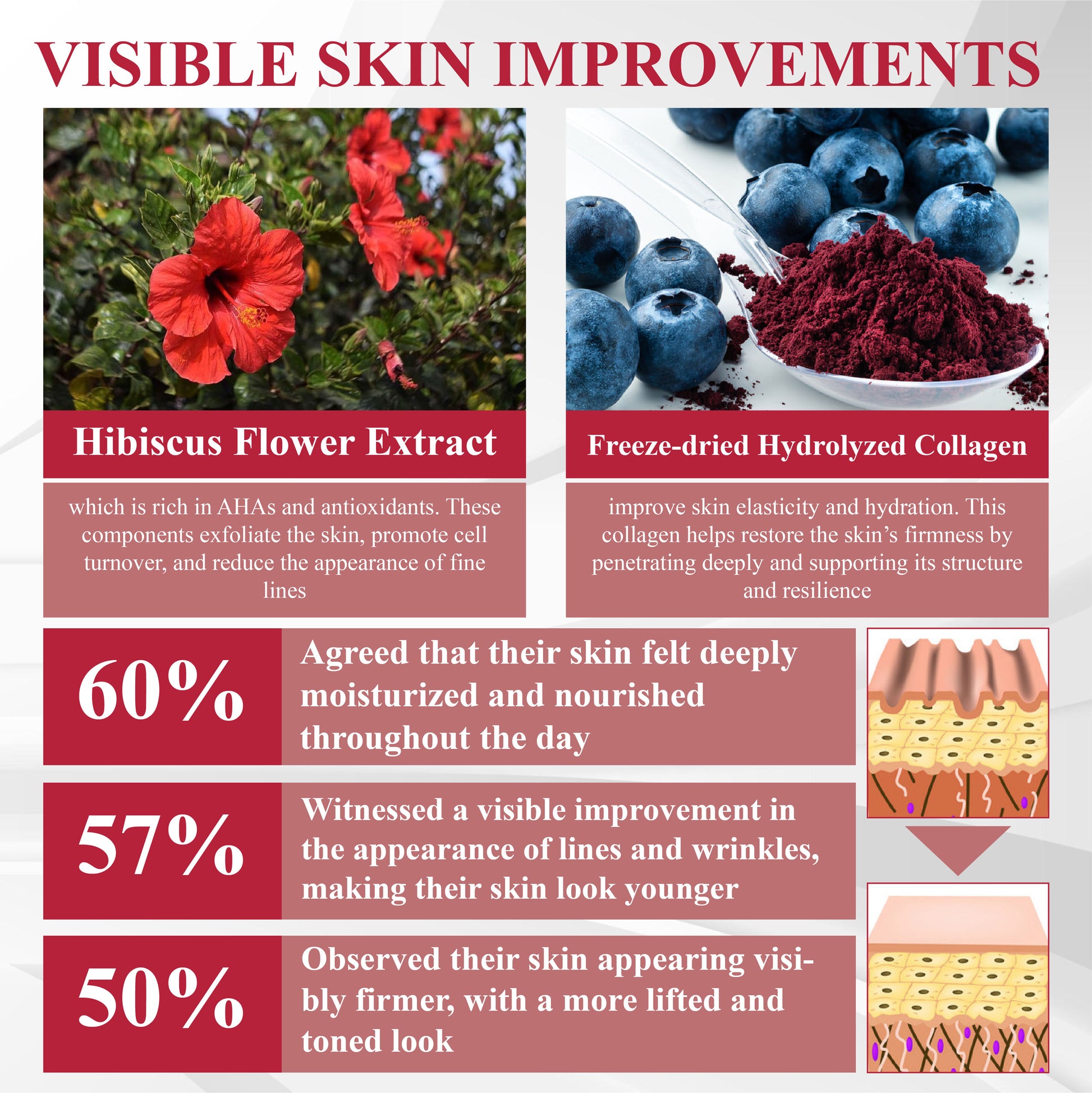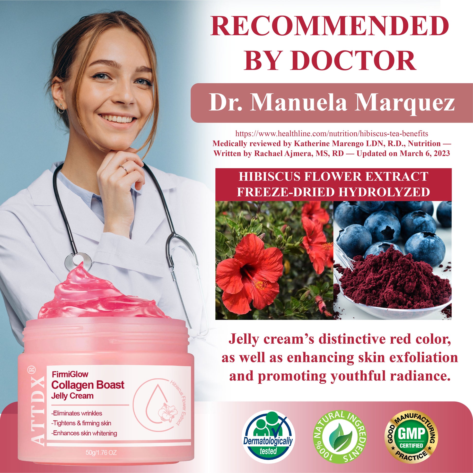 Certified by Dr. Manuela Marquez, a renowned dermatologist at the American Academy of Dermatology (AAD), this study, conducted on January 22, 2025, highlights the efficacy of ATTDX® FirmiGlow Collagen Boast Jelly Cream. The product contains 3% Hibiscus Flower Extract and 7% Freeze-dried Hydrolyzed Collagen, which together provide significant skin benefits.