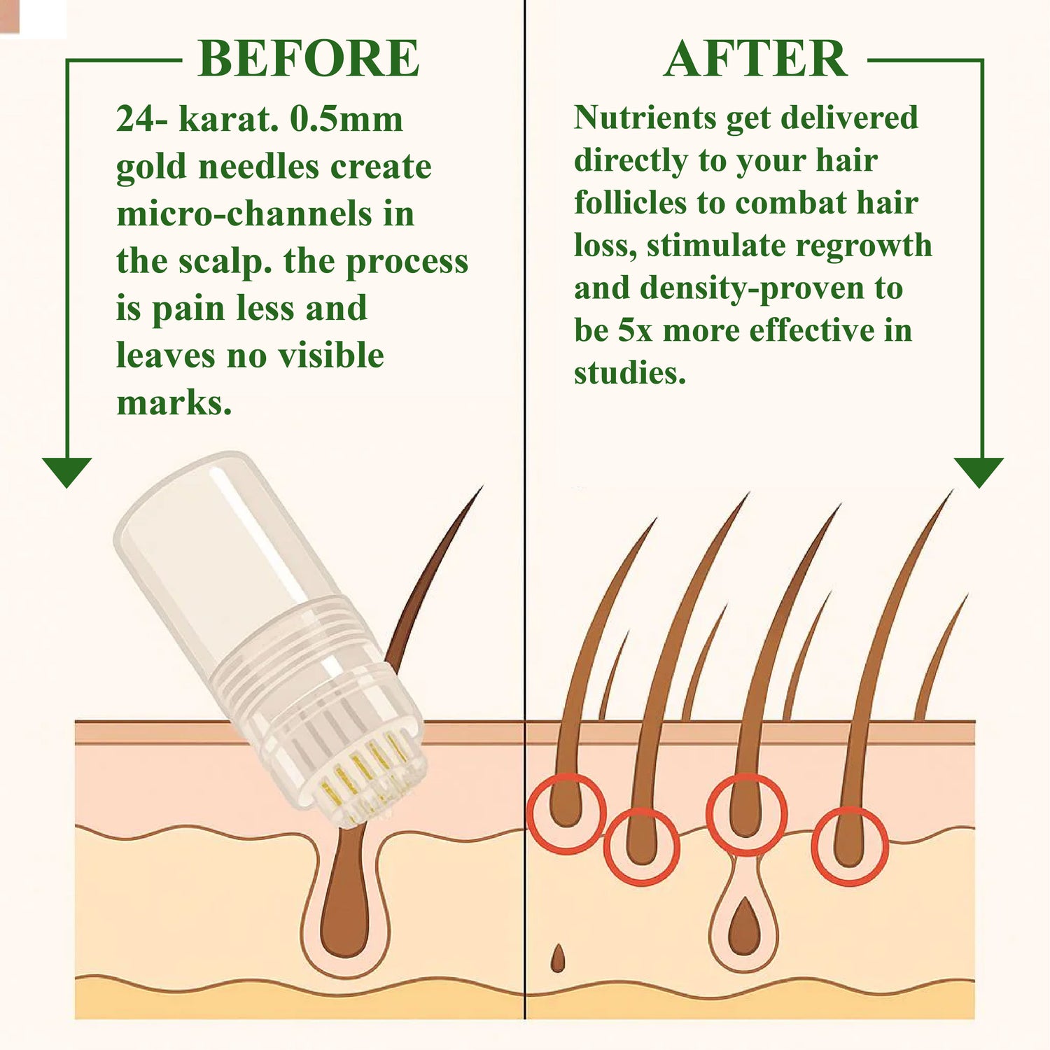 Unlike traditional serums that sit on the surface, the microneedle infusion allows deeper penetration of EGCG, Biotin, and Copper Peptide. This direct-to-root delivery helps stimulate dormant follicles for faster and more visible regrowth.