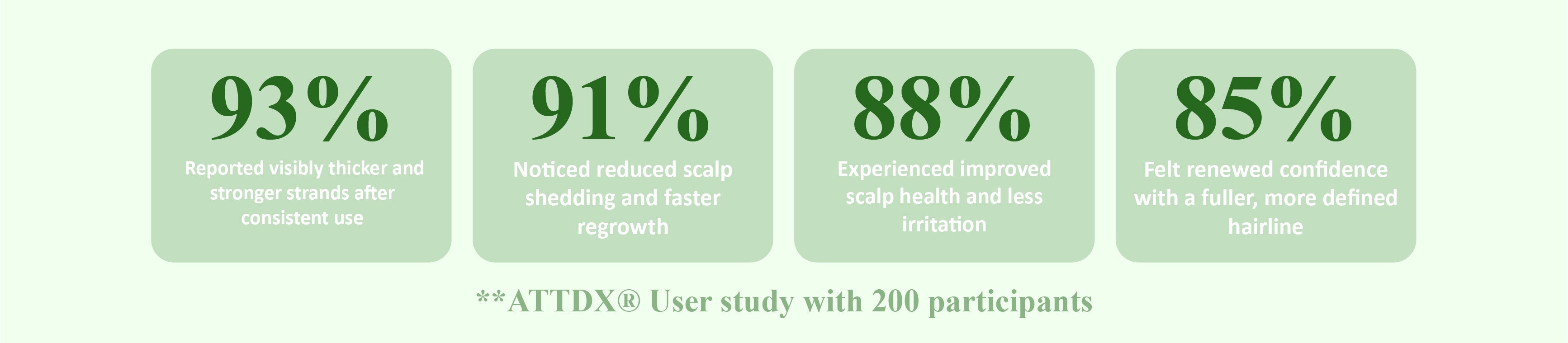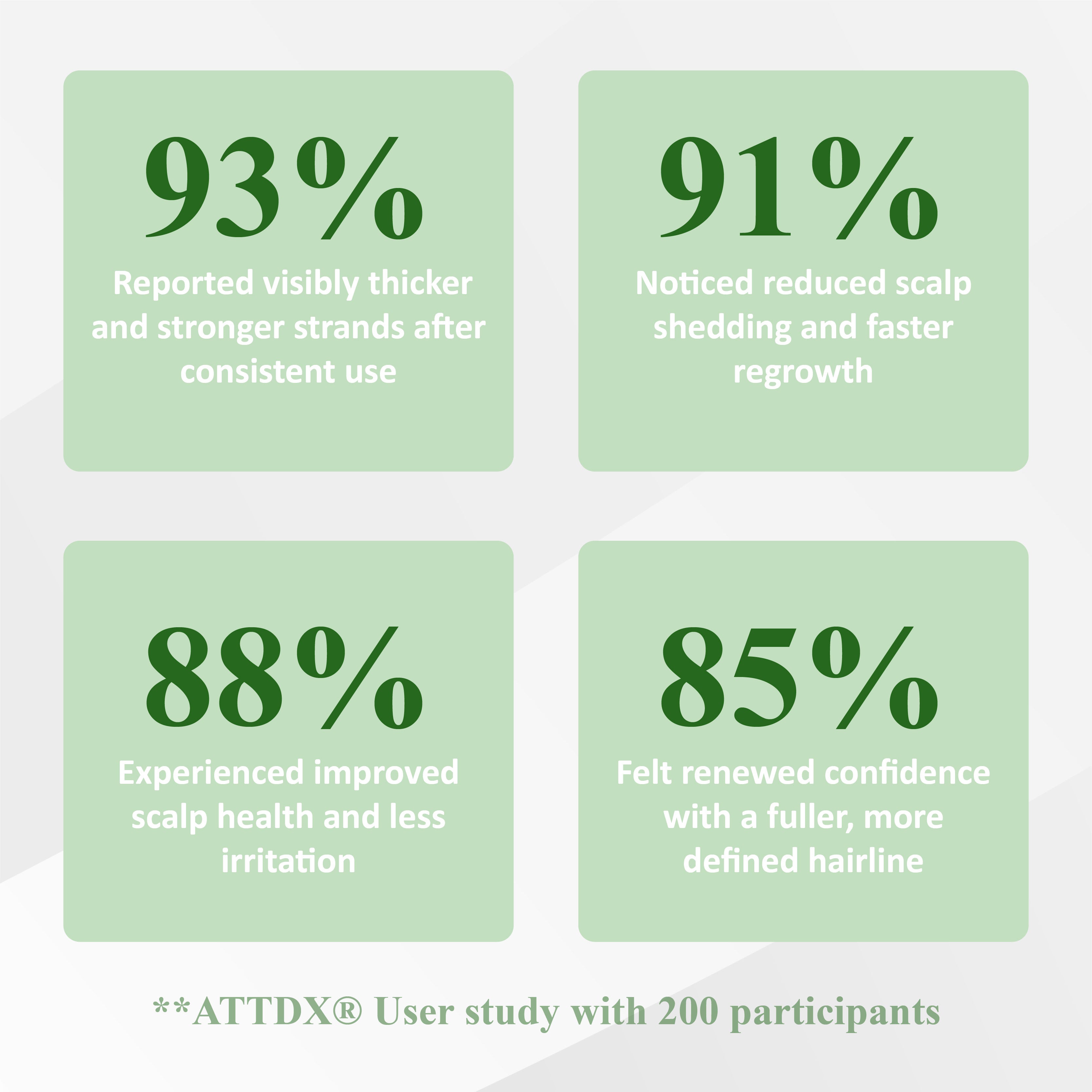 No need for lengthy routines or complicated steps. Simply stamp ATTDX® onto thinning areas with a gentle tap, taking less than a minute. Notice visible improvements within days and enjoy thicker, healthier hair with continued use.