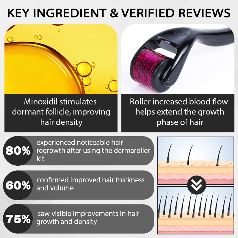 The dermaroller is equipped with microneedles that creates microchannels in the scalp allowing the serum to penetrate deeper into the hair follicles, rather than simply sitting on the surface. Monica Mitchel. MD recommends this kit for its ability to deliver faster and more noticeable results in hair regrowth.