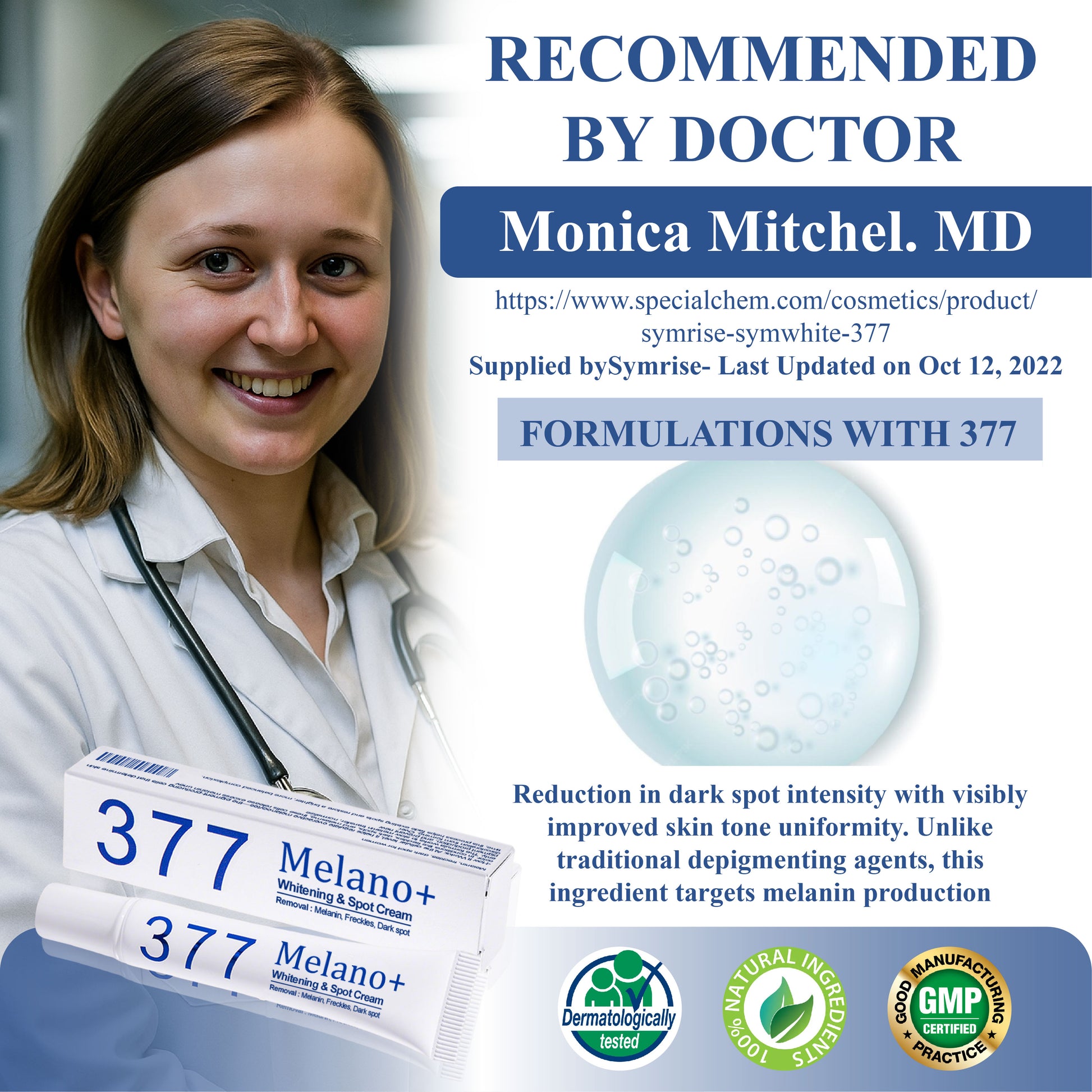 In clinical research, participants using formulations with 377 demonstrated up to a 70 percent reduction in dark spot intensity within four weeks, along with visibly improved skin tone uniformity. Unlike traditional depigmenting agents, this ingredient targets melanin production precisely without compromising the skin barrier. It provides an advanced, well-tolerated approach to achieving clearer, more balanced skin.