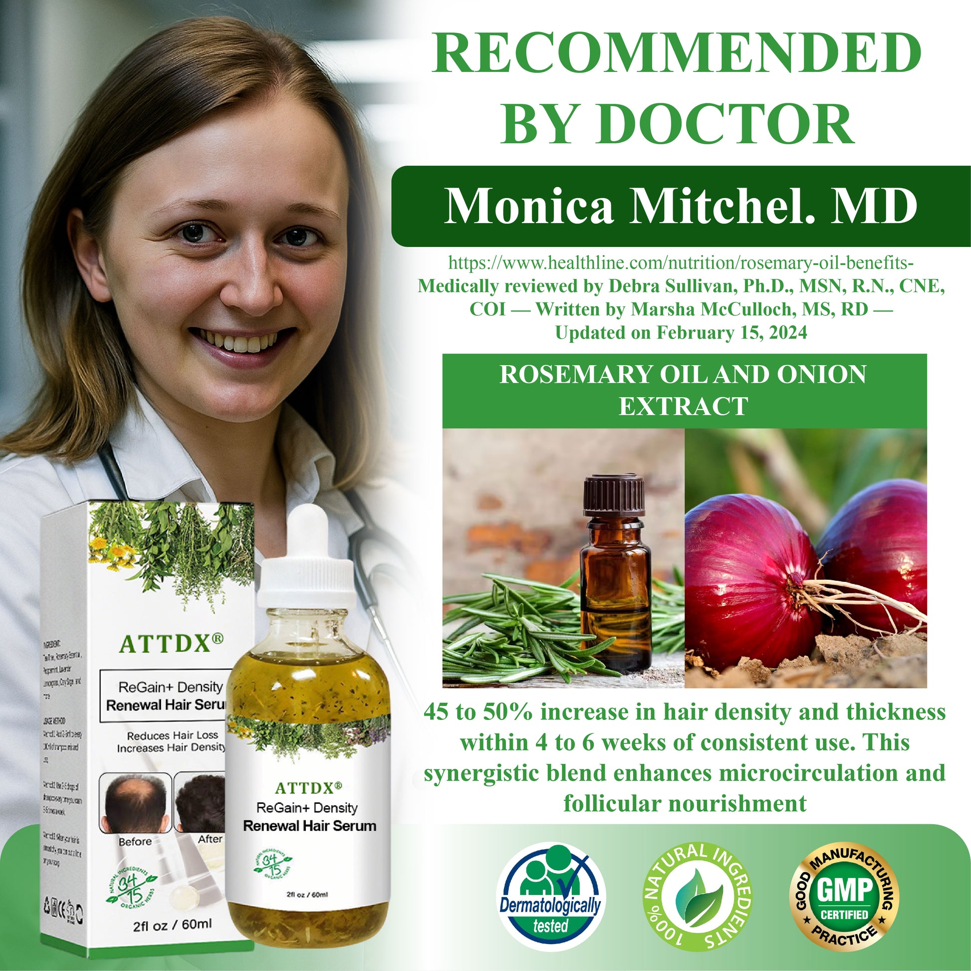 Bring back thicker, stronger hair with ATTDX® ReGain+ Density Renewal Hair Serum. Powered by Rosemary Oil and Onion Extract, it boosts growth, reinforces weak strands, and restores a fuller, healthier look