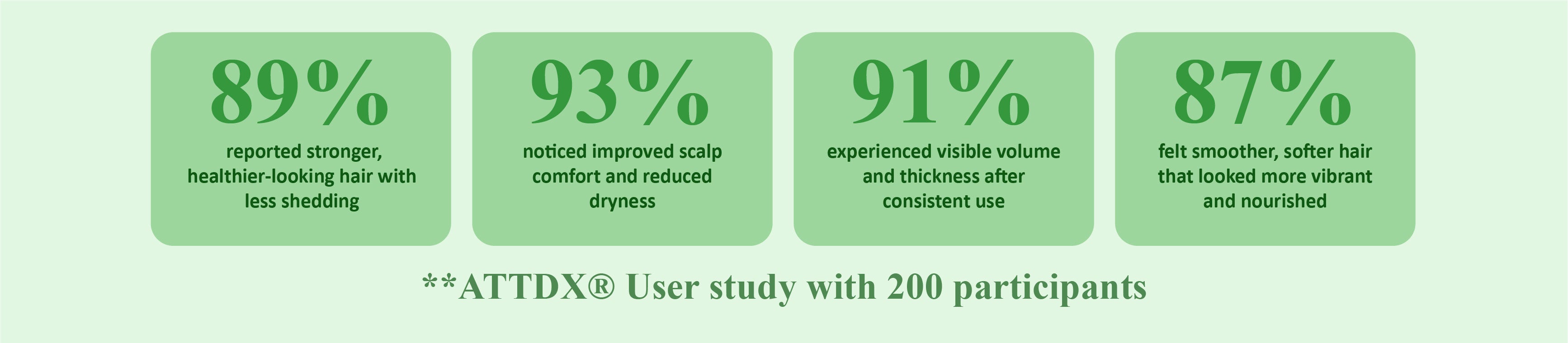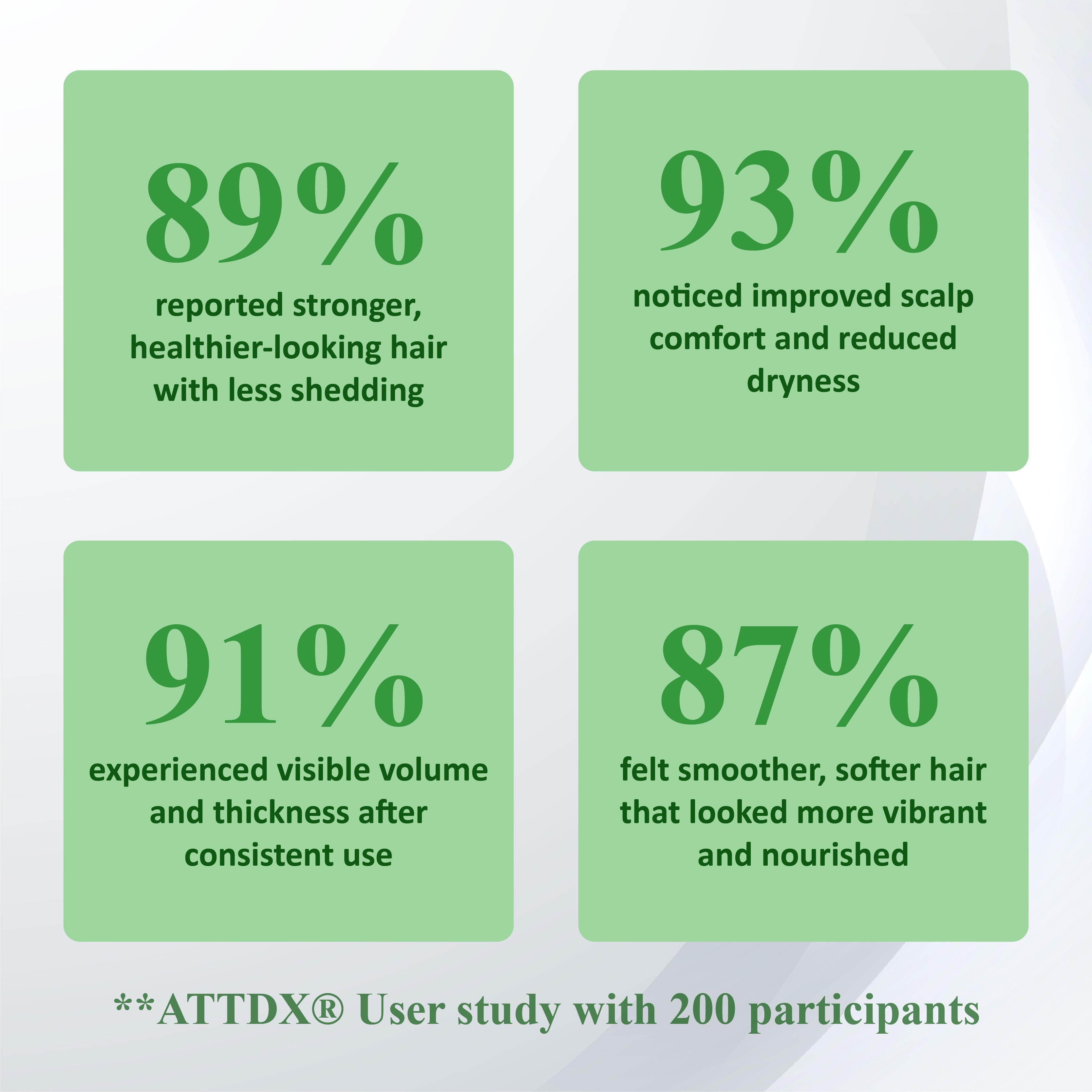 ATTDX® Serum is enriched with Rosemary Oil and Onion Extract thathas demonstrated up to a 45 to 50% increase in hair density and thickness within 4 to 6 weeks of consistent use. This synergistic blend enhances microcirculation and follicular nourishment while extending the active growth phase while minimizing breakage and shedding.
