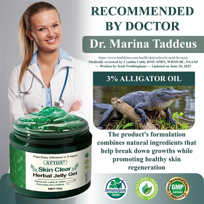 According to Dr. Marina Taddeus, a renowned dermatologist at the Skin Health Institute, ATTDX® Skin Clear Herbal Jelly Gel, containing 3% Alligator Oil, is an effective solution for the removal of skin tags, moles, and warts.