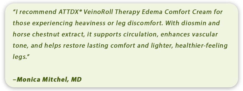 ATTDX® VeinoRoll Therapy Edema Comfort Cream combines diosmin and horse chestnut extract, two venotonic compounds clinically shown to work better together than alone.