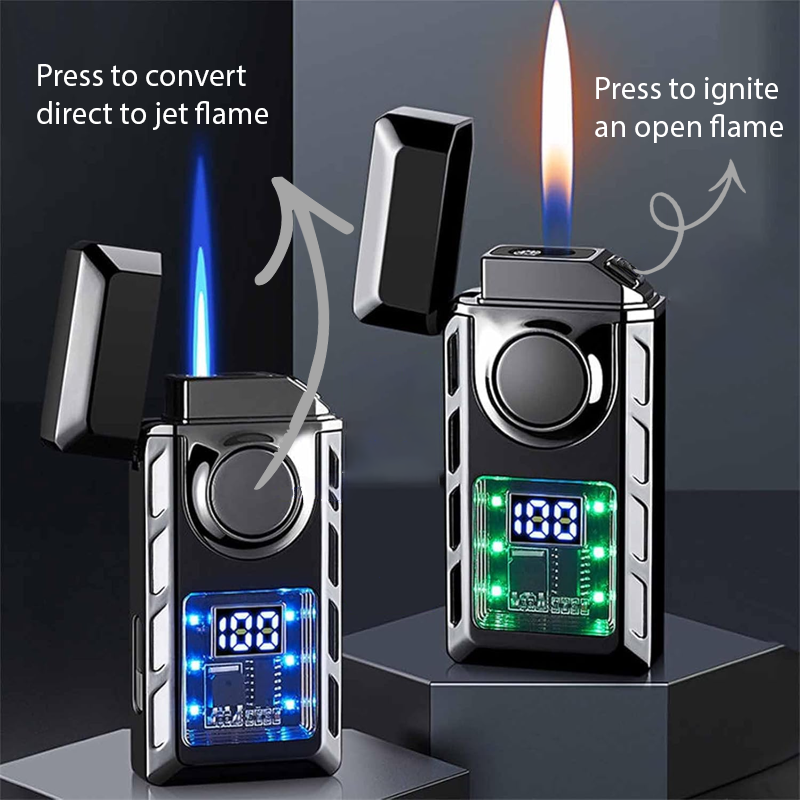local_fire_department Switch between open flame and windproof jet mode with a durable, metal tech-style build