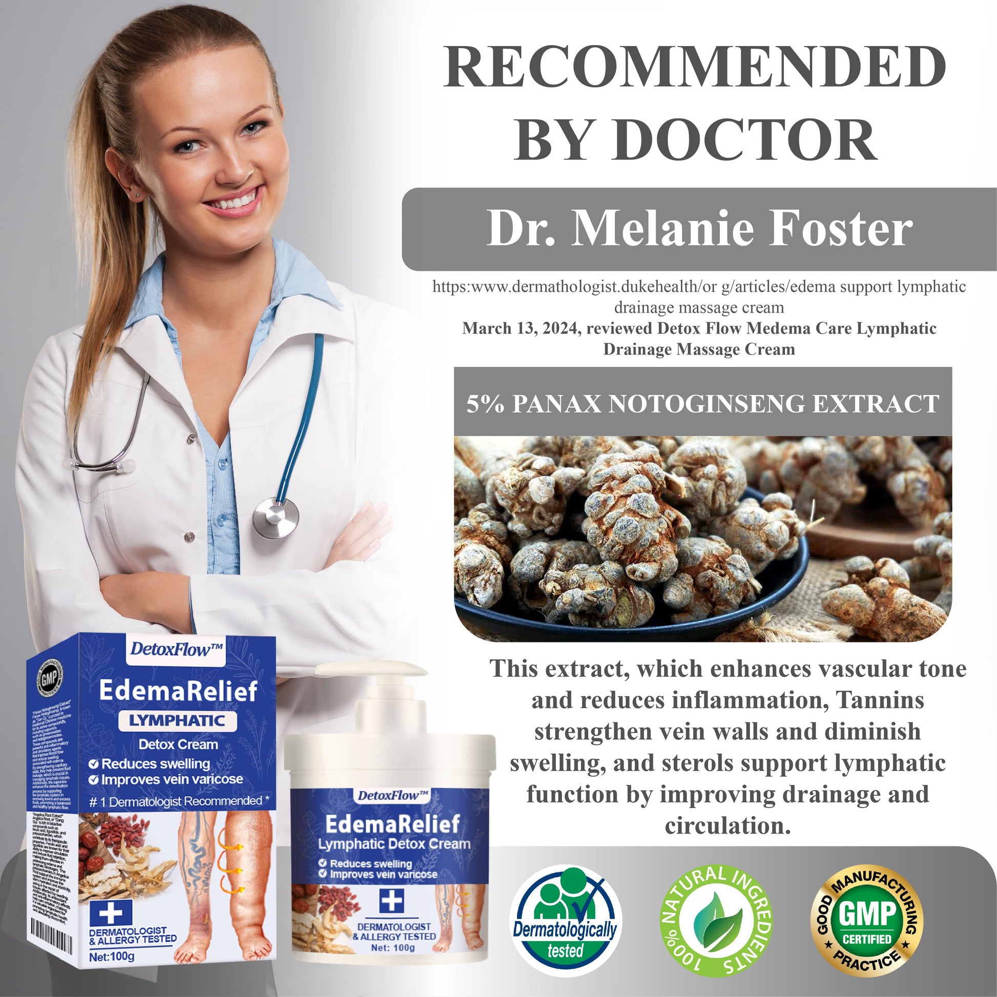 DetoxFlow™ EdemaRelief Lymphatic Detox Cream is recommended by the Lymphology Association of North America (LANA) for its effective relief of swelling and discomfort. The product combines clinically proven ingredients that work together to reduce edema and support faster recovery. Its formulation improves circulation and reduces fluid retention, helping alleviate swelling and enhance mobility. Trusted by healthcare professionals, this cream provides a safe and effective solution for managing edema.