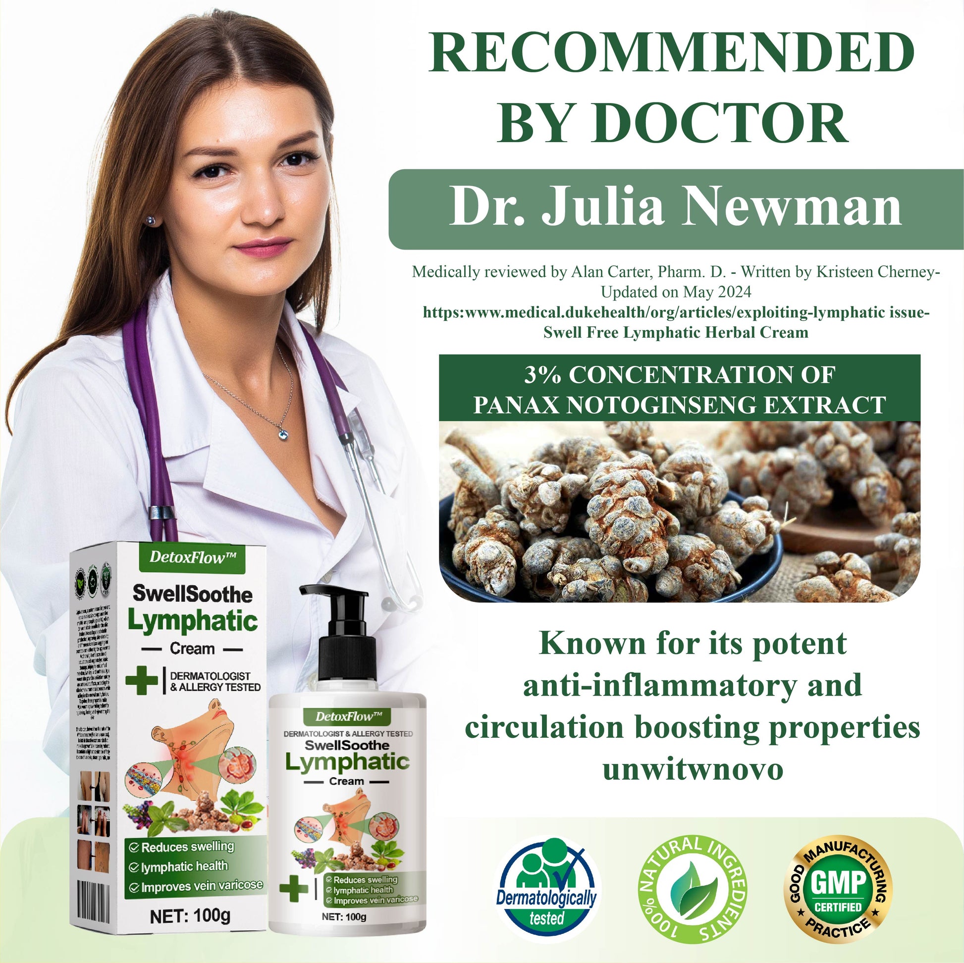 Certified by Dr. Julia Newman, M.D., of the National Institute of Lymphatic Health, May 14, 2024, DetoxFlow™ SwellSoothe Lymphatic Cream has demonstrated significant effectiveness in supporting lymphatic health.