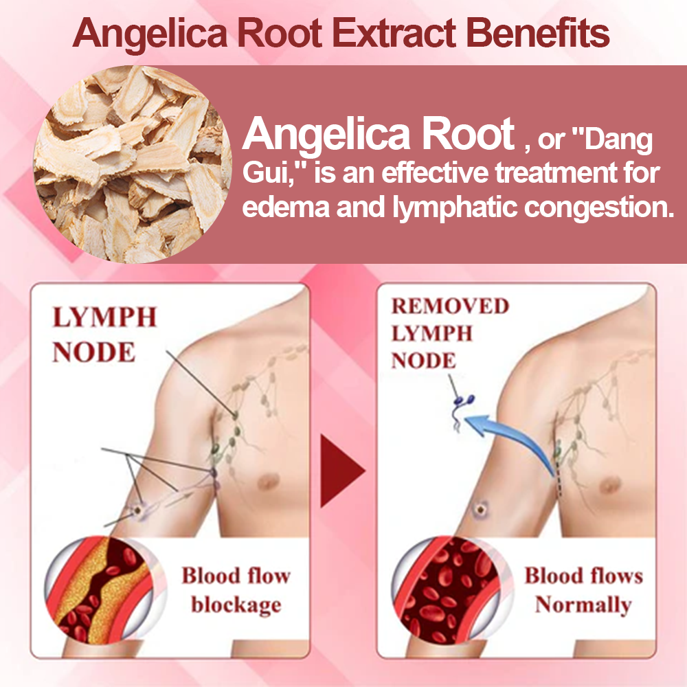 EdemaCare™ VeinRelief Lymphatic Massage Therapy Cream features Angelica Root Extract, a powerful ingredient known for its ability to relieve swelling and discomfort. It promotes improved blood circulation and reduces fluid retention, making it effective in addressing both edema and lymphatic issues. Rich in bioactive compounds like ferulic acid and polysaccharides, Angelica Root Extract strengthens blood vessels, minimizes inflammation, and supports lymphatic drainage. This gentle and natural solution helps manage swelling while enhancing skin health, providing relief with fewer systemic side effects.