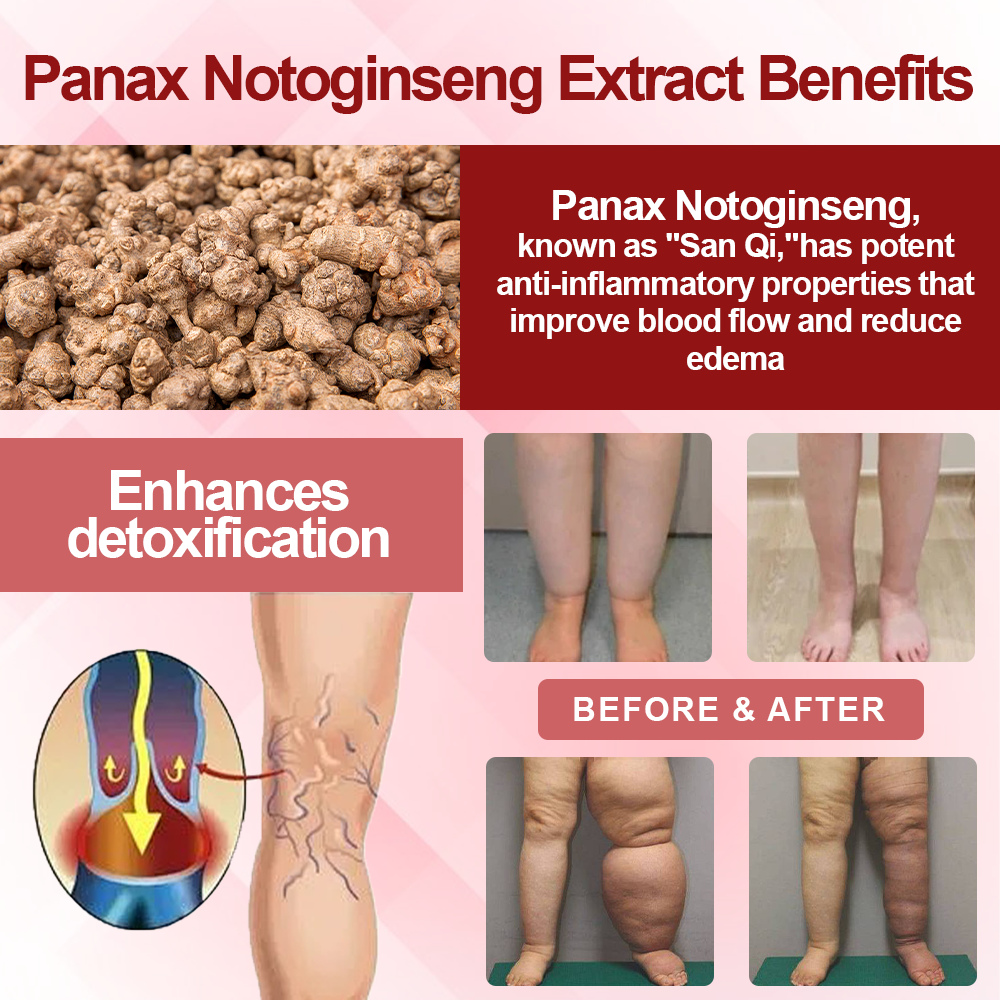 EdemaCare™ VeinRelief Lymphatic Massage Therapy Cream harnesses the potent properties of Panax Notoginseng Extract to effectively combat edema and swelling. This extract contains ginsenosides and notoginsenosides, which improve vascular tone, enhance blood circulation, and reduce inflammation, while its natural saponins provide antioxidant protection to capillaries. Polysaccharides strengthen blood vessel walls and reduce swelling, while its detoxifying properties support lymphatic function by promoting effective drainage and fluid balance.