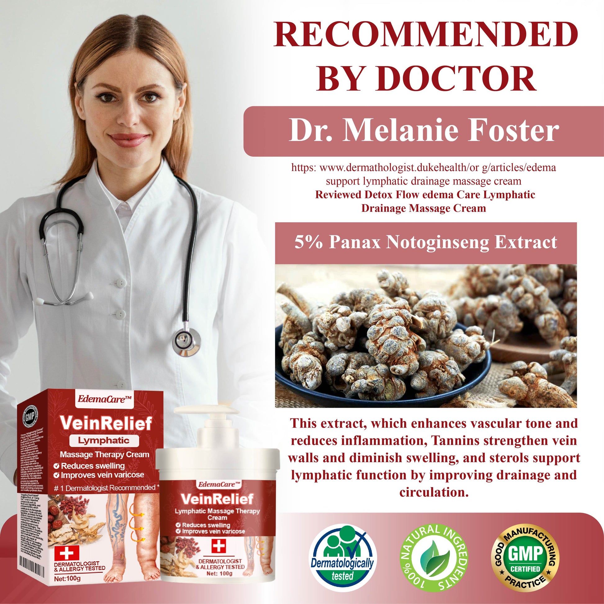 EdemaCare™ VeinRelief Lymphatic Massage Therapy Cream harnesses the power of key botanical extracts to deliver exceptional relief from swelling and discomfort. Panax Notoginseng Extract enhances circulation, reduces fluid retention, and strengthens capillary walls, while Angelica Root Extract improves blood flow, minimizes inflammation, and supports lymphatic drainage. Horse Chestnut Extract enhances vascular tone and reduces swelling, and Ruscus Acuminata Extract supports vein health and alleviates discomfort. Together, these ingredients work synergistically to address edema effectively, offering a natural and soothing solution for enhanced comfort and reduced swelling.