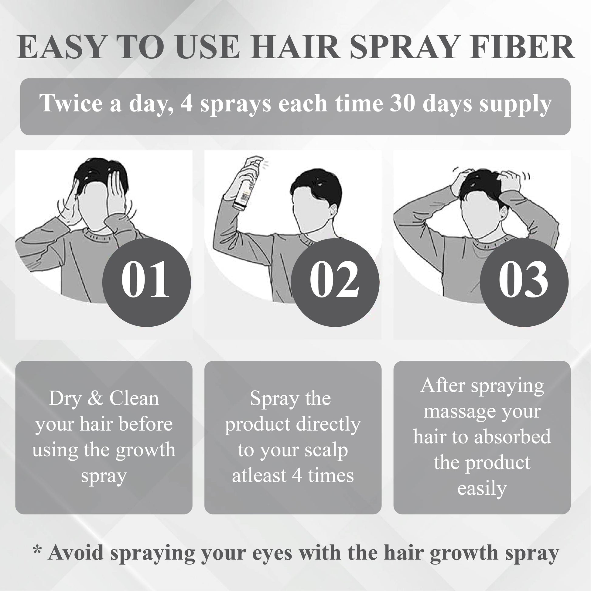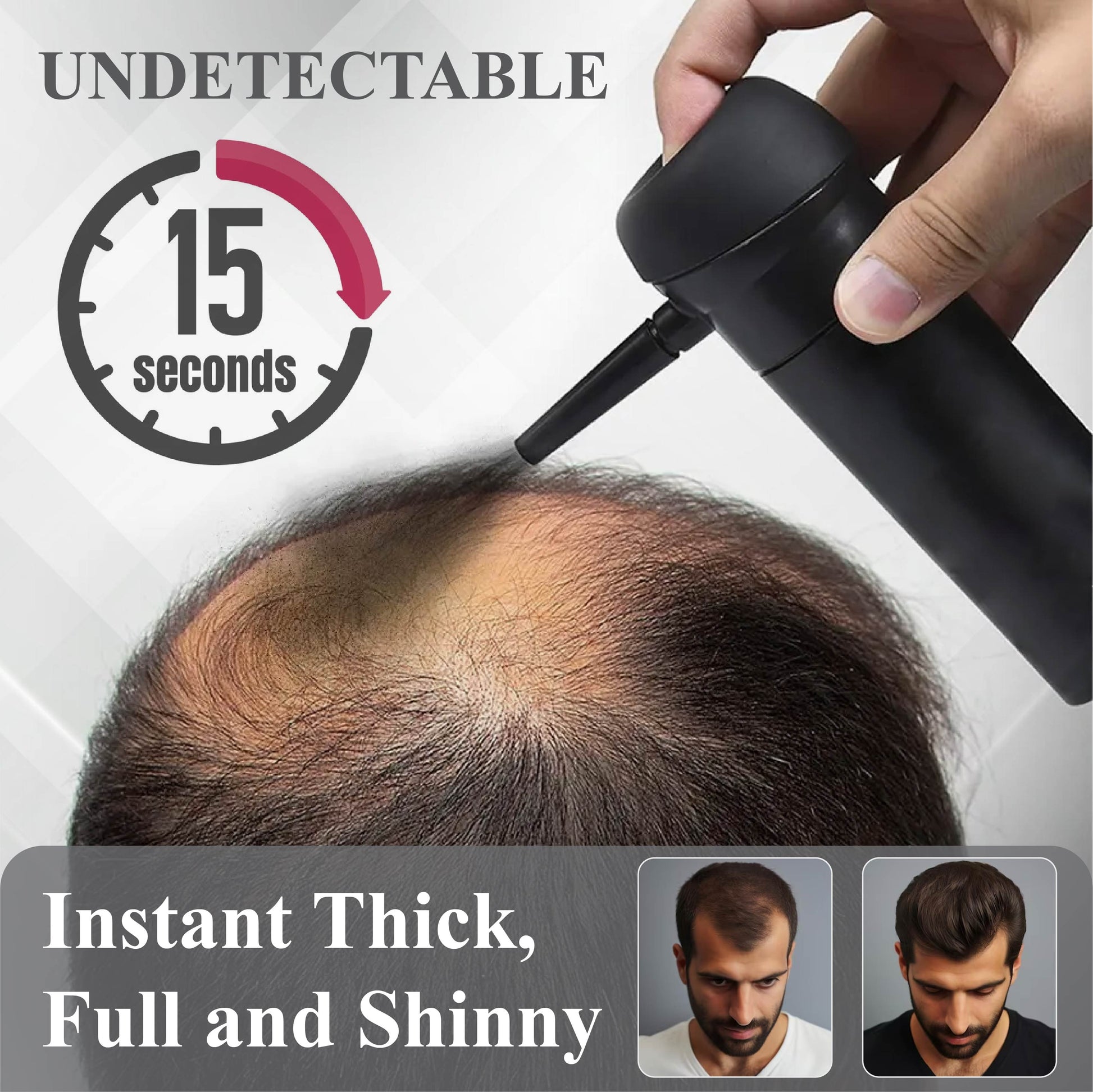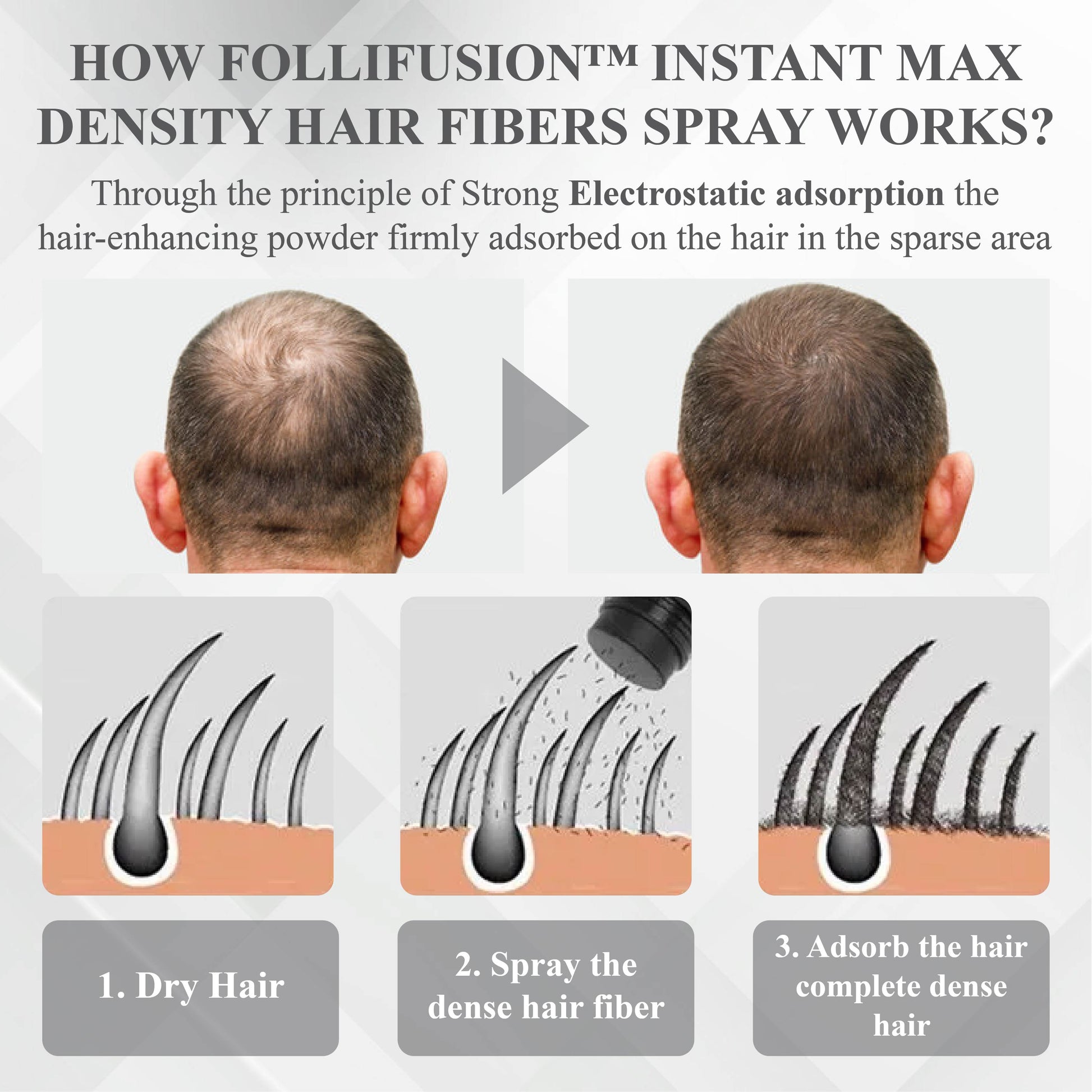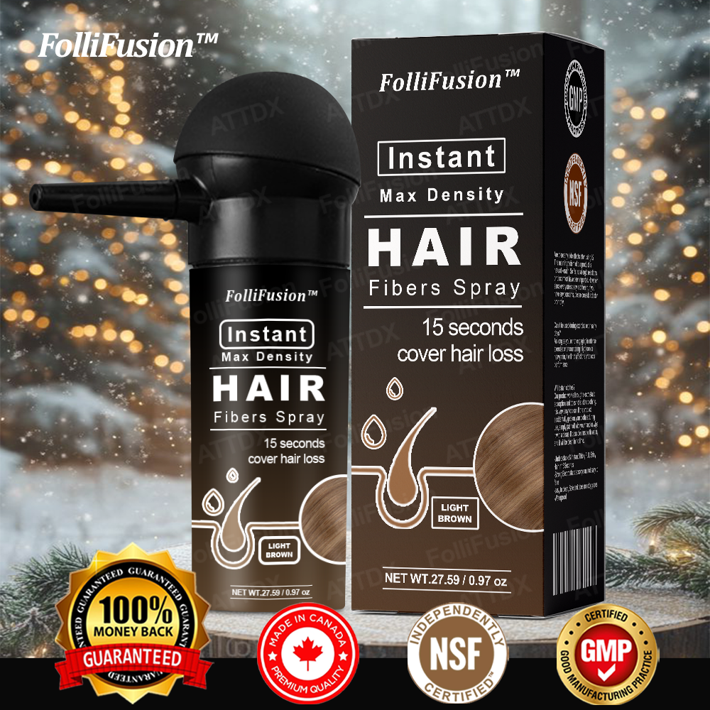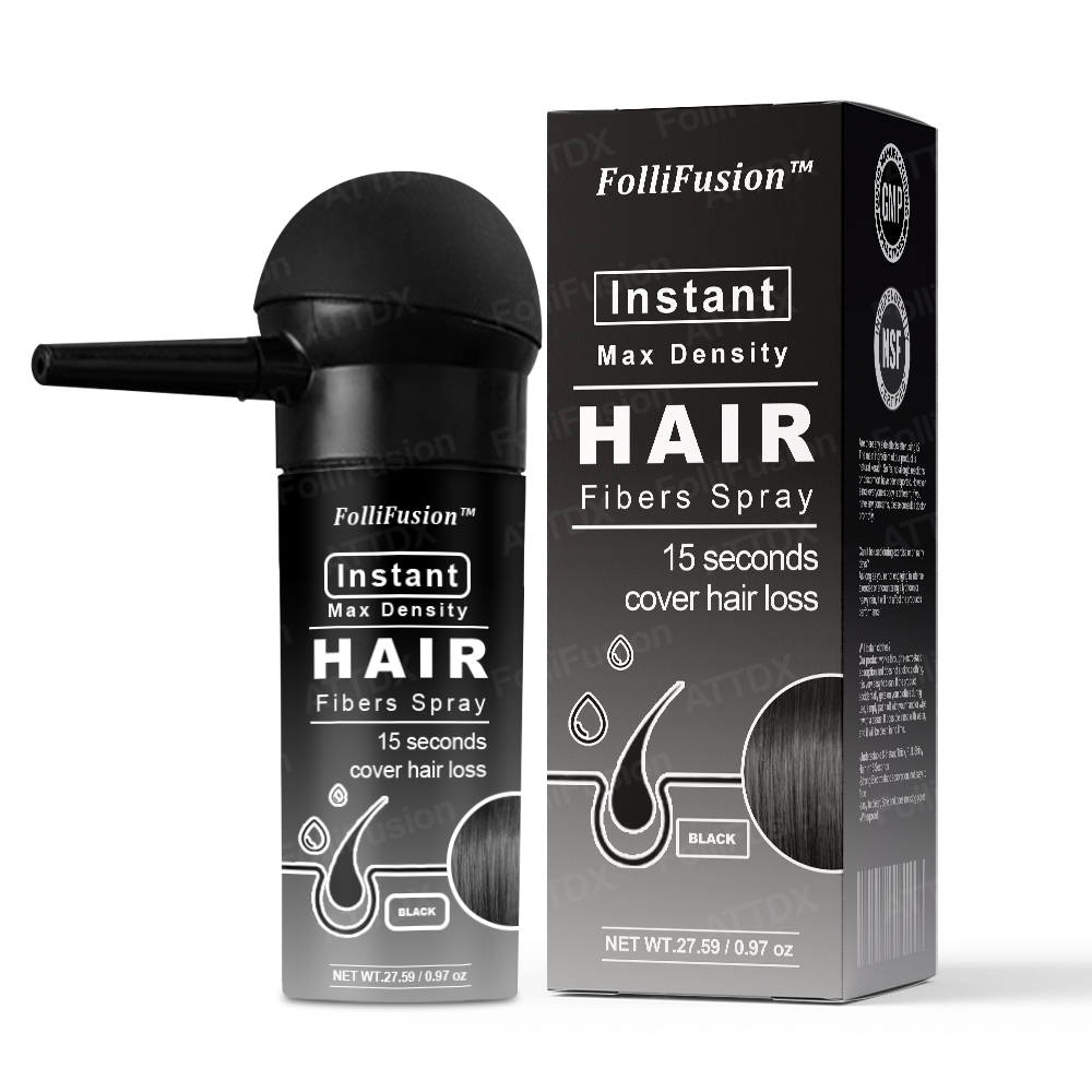FolliFusion™ Instant Max Density Hair Fibers Spray delivers thick, full, and shiny hair in just 15 seconds. Its strong electrostatic adsorption ensures the fibers stay in place even under bright lights or camera flashes and remaining completely undetectable.