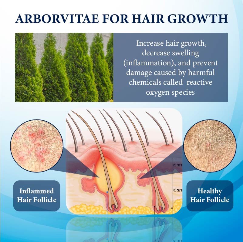 Arborvitae extract helps regulate hormonal levels in the body, addressing one of the primary causes of hair loss. By balancing these hormones, it reduces hair fall and stimulates the growth of new, healthy hair follicles.
