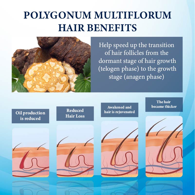 Polygonum multiflorum extract enhances blood circulation to the scalp, which is crucial for nourishing hair follicles. It strengthens hair roots and promotes the regeneration of healthy, robust hair.