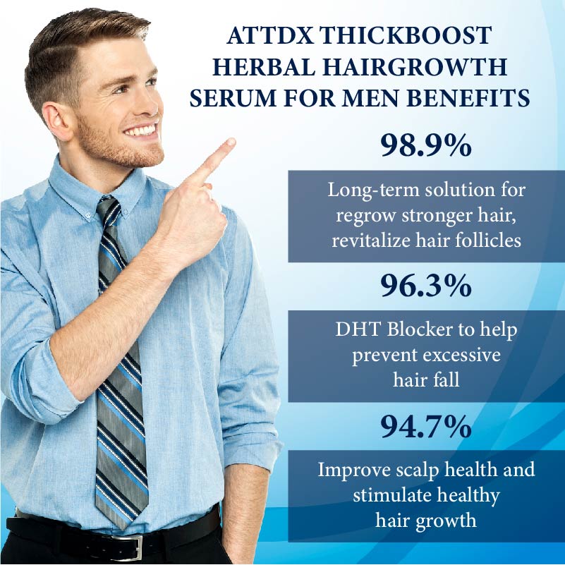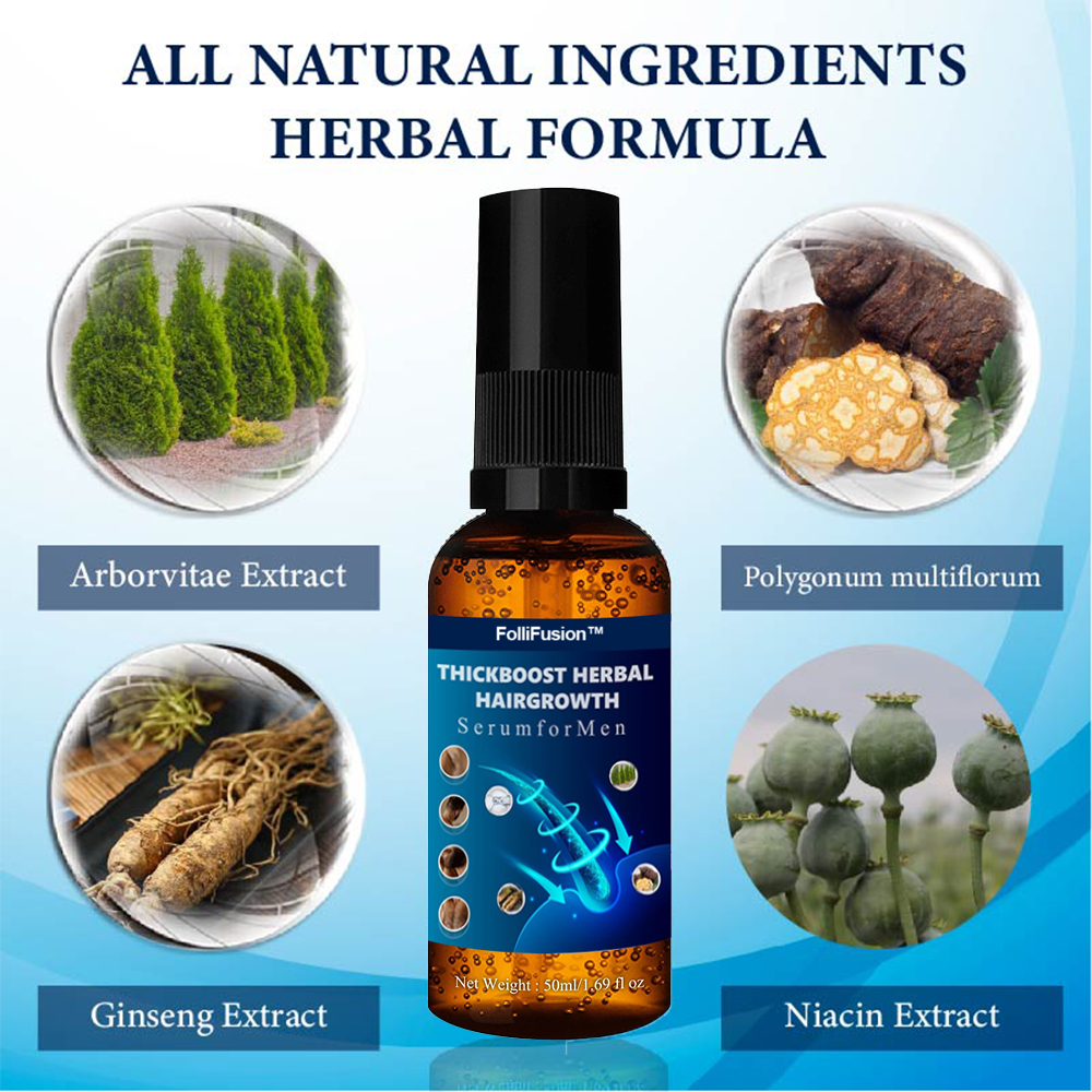 The FolliFusion™ ThickBoost Herbal HairGrowth Serum for Men features a powerful blend of ingredients that is carefully selected for their proven benefits in stimulating and enhancing hair growth.