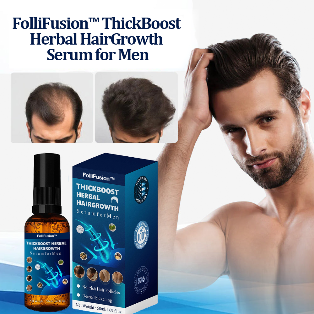 Transform your hair’s strength and volume with FolliFusion™ ThickBoost Herbal HairGrowth Serum for Men, designed to deliver thicker and healthier hair