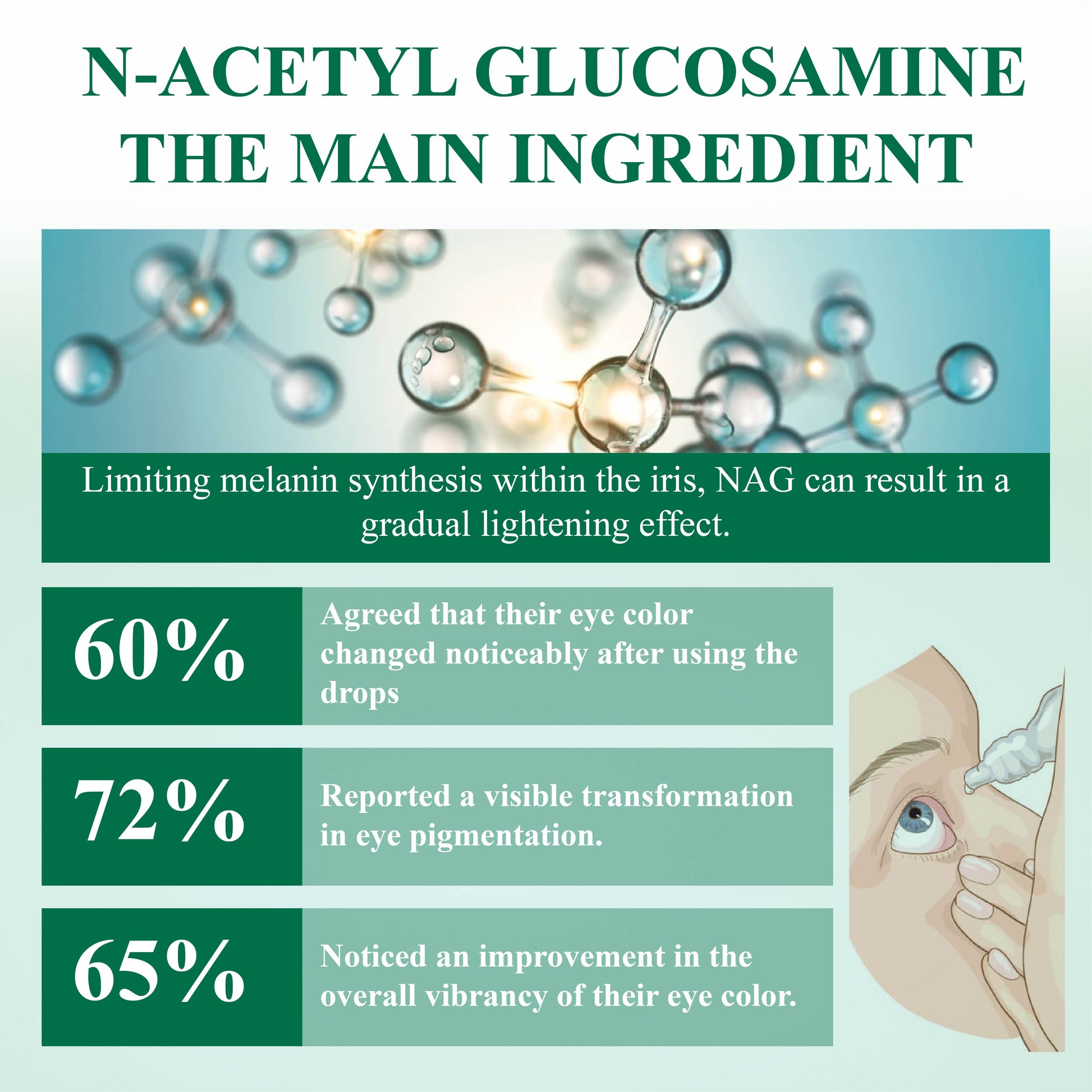 IrisLuma™ Advanced Eye Color Changing Drops use N-Acetyl Glucosamine to gently reduce pigmentation by inhibiting tyrosinase, the enzyme key to melanin production. This ingredient penetrates deeply, enabling a safe, non-invasive approach to subtly lighten the iris color.