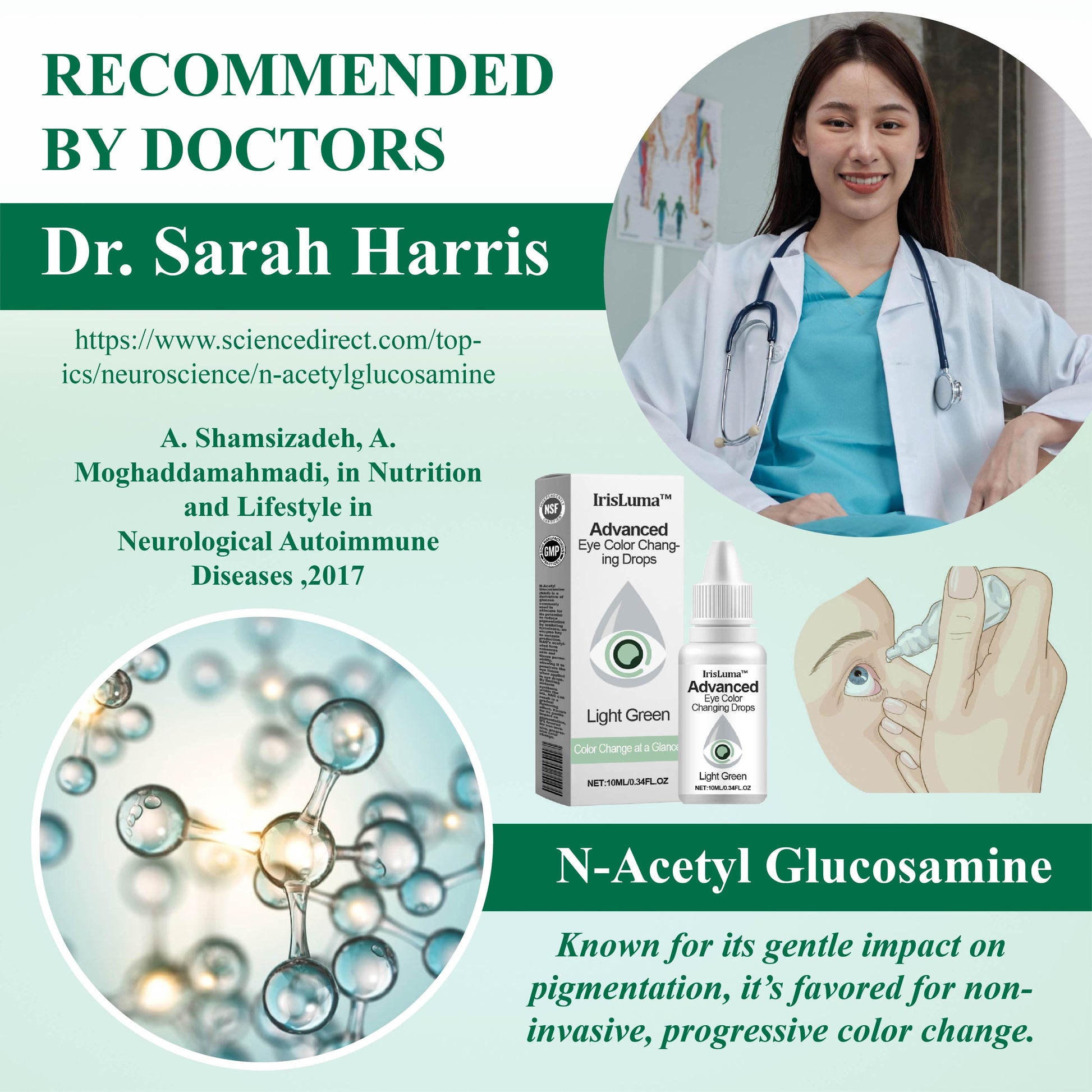 Endorsed by Dr. Sarah Harris of the National Eye Institute on August 7, 2024, IrisLuma™ Advanced Eye Color Changing Drops present a groundbreaking solution for safe and effective eye color transformation. Featuring a precise 1% concentration of N-Acetyl Glucosamine, these drops gently promote color change while maintaining eye health, comfort, and ensuring careful and safety usage.