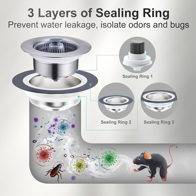 language Effectively filters debris, prevents clogs, and seals water flow with a versatile 3-in-1 design for improved sink efficiency