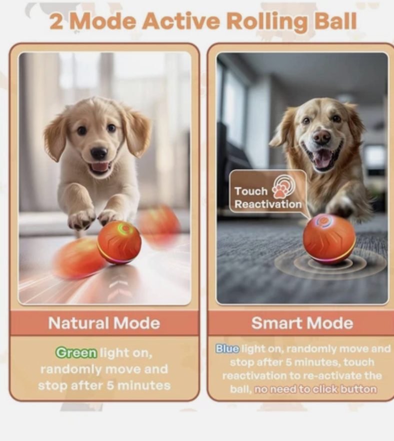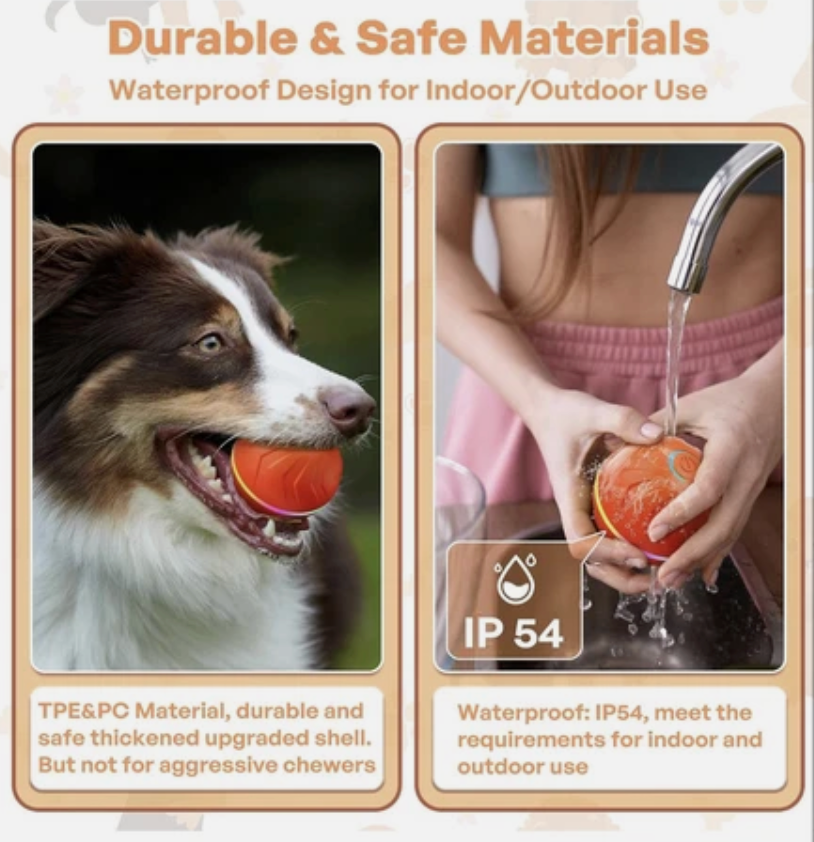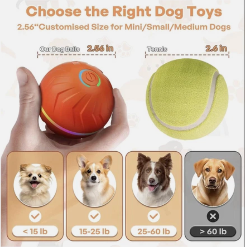 Bouncing Ball is equipped with a powerful motor and works on all kinds of surfaces - wood flooring, tile, carpet - you name it! Moreover, with a built-in high-capacity battery, your playtime is extended for long hours, so there's no need to buy batteries or charge it every day.Just charge it with an included USB cord and enjoy endless playtime!