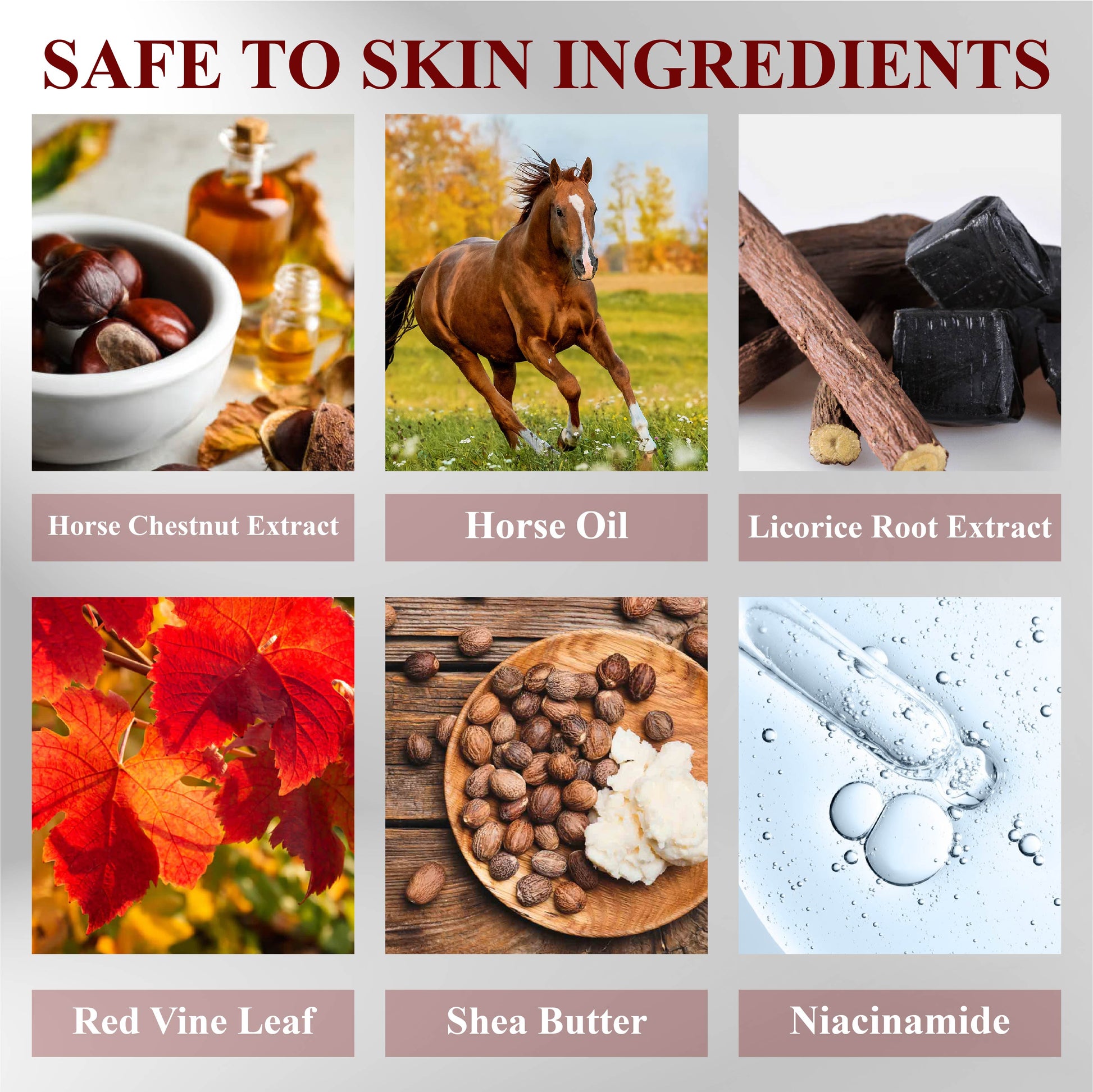 RelievaDerm™ Horse Chestnut Skin Therapy Gel combines powerful ingredients for skin relief and hydration. Horse Chestnut extract improves circulation and reduces inflammation, while Horse Oil deeply nourishes and restores moisture. Red vine leaf helps support vein health and reduces skin irritation, and Licorice Root Extract brightens and soothes the skin. Niacinamide and Shea Butter work together to improve elasticity, even skin tone, and provide intense hydration.