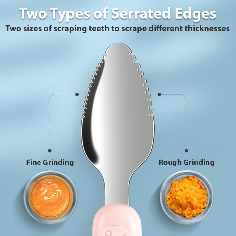 Designed for safe and efficient feeding, the RICPIND® Dual-End Baby Fruit Scraper Spoon features two types of serrated edges to suit different puree textures. Its dual-size scraping teeth work perfectly for both soft and firm fruits and vegetables. The easy-grip handle and smooth edges ensure it’s gentle on your baby’s gums, tongue, and lips.