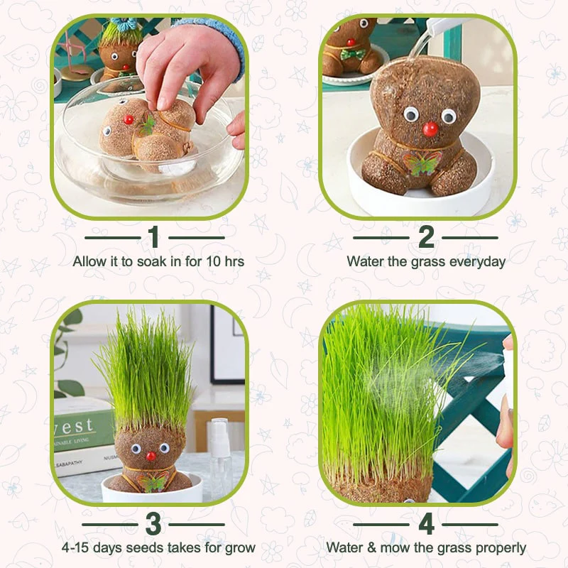 Made with the highest-grade, non-fading eco-friendly material that’s infused with low maintenance growing plant seeds. It does not easily die or withered and can accompany you for months with proper care. Additionally, this growing grass head doll does not leach toxic chemicals and is also safe and edible for cats!