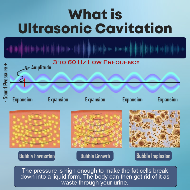 This innovative procedure employs ultrasonic radio waves to break apart targeted adipose tissue beneath the skin. When sound waves travel through body fluids, the pressure changes form tiny bubbles in the fluid. Under the pressure of the sound waves, these bubbles expand and contract rapidly, eventually creating high temperatures and pressures, which generate energy used to promote the breakdown and metabolism of adipose tissue, decrease adipose deposits, and improve skin firmness. The dislodged cells are then absorbed by the lymphatic system and eliminated as waste. Beyond its contouring effects, ultrasonic cavitation significantly aids in lymphatic drainage, facilitating the removal of toxins from the body. This treatment serves as a cost-effective alternative to liposuction and other invasive procedures. By reducing body mass and improving body shape, ultrasonic cavitation provides a safe and effective solution for those seeking to enhance their physical appearance. This dual action of body shaping and detoxification makes it a popular choice for individuals aiming to achieve a more toned and healthy physique. We created our product using Ultrasonic Cavitation technology, ensuring it is an effective solution for body contouring and detoxification. Experience the benefits of a toned physique and improved overall wellness with our advanced treatment.