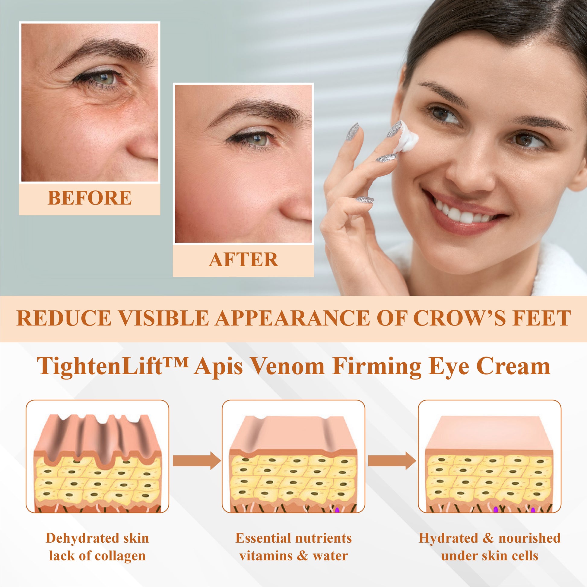 At TightenLift™, we deliver targeted solutions for refreshed and youthful eyes with effective yet gentle care. Our TightenLift™ Apis Venom Firming Eye Cream is designed to rejuvenate the delicate skin around the eyes, reducing puffiness and fine lines. With regular use, it helps brighten dark circles and enhances skin firmness, leaving you with a refreshed and youthful appearance.